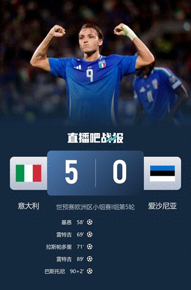 直播吧9月6日讯 据《共和报》报道称,意大利5-0爱沙尼亚的比赛期间,比赛一度因电话铃声中断。