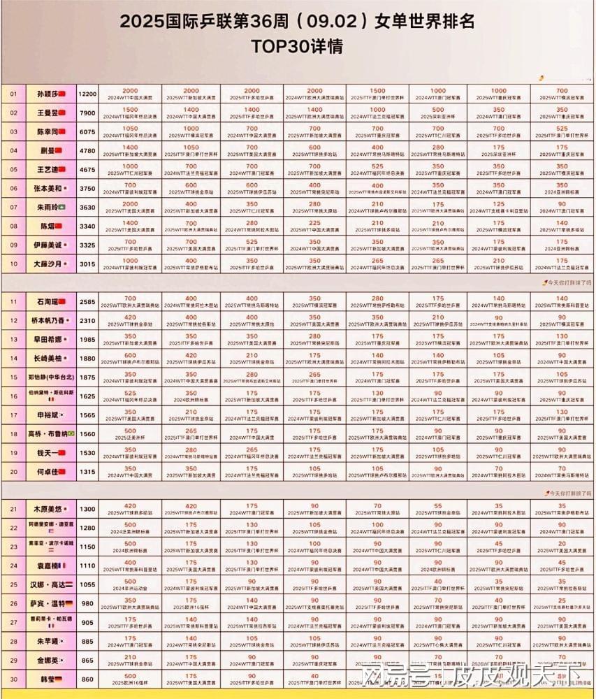 北京时间2025年9月2日,国际乒联公布了2025年第36周的最新排名。