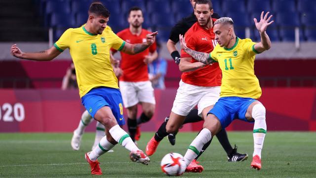 巴西国奥阵容:1-桑托斯/13-阿尔维斯、15-尼诺、3-迭戈·卡洛斯、6-阿拉纳/5-道格拉斯·路易斯、8-吉马良斯/11-安东尼、9-库尼亚、20-克劳迪尼奥/10-理查利松