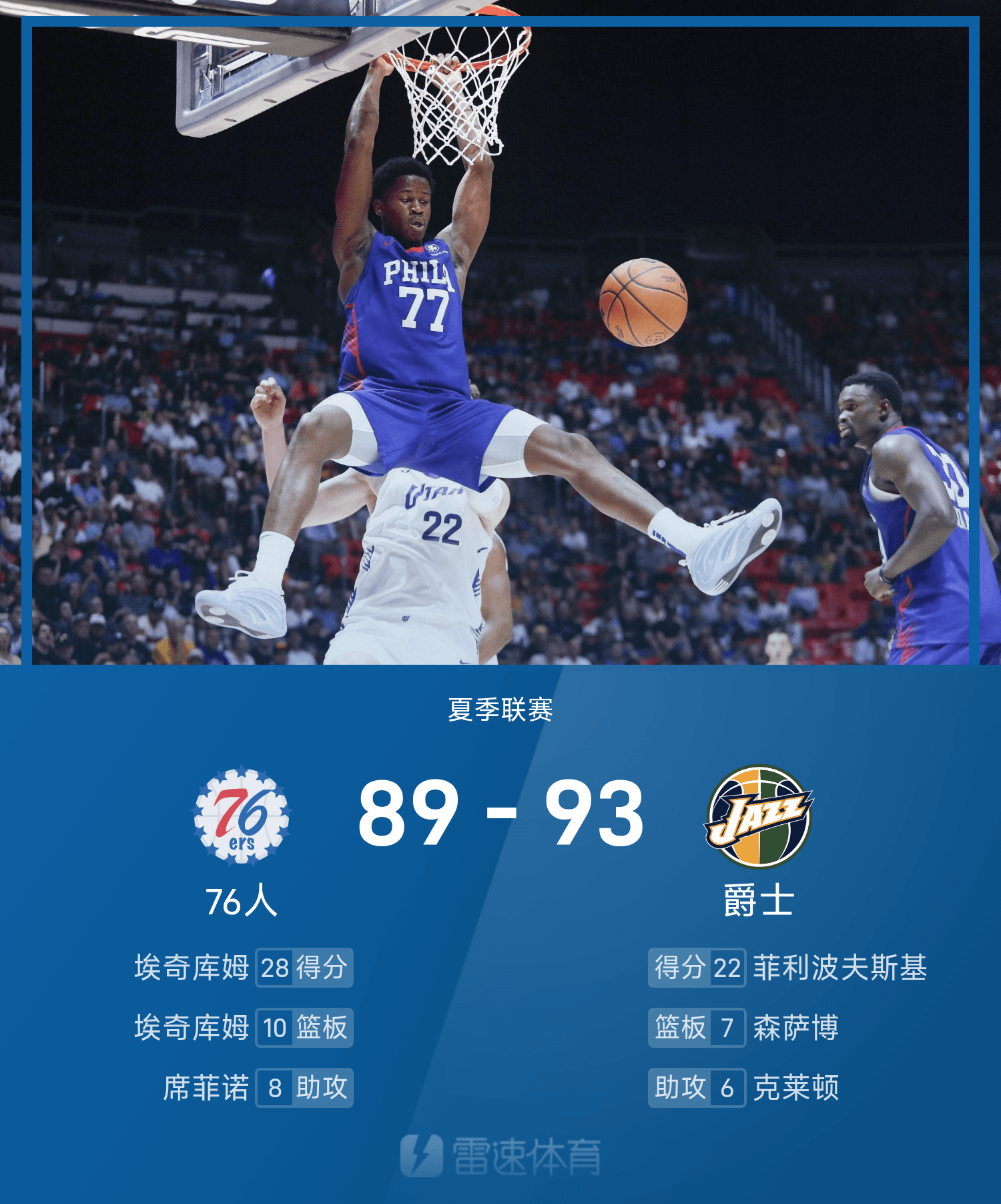 07月06日讯 25赛季夏季联赛,爵士对阵76人。双方全场战罢,爵士93-89战胜76人。菲利波夫斯基得到22分6板2助率队取胜,埃奇库姆空砍全场最高的28分10板4助。球员数据 查看更多详细数据 查看更多
